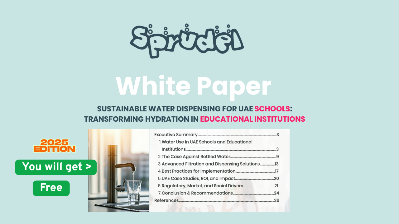 Explore how UAE schools can dramatically reduce plastic waste, lower costs and ensure safe, sustainable hydration for students and staff. This whitepaper presents a comprehensive analysis of water use in educational institutions, the environmental and financial drawbacks of bottled water and the benefits of advanced filtration and dispensing systems tailored for the UAE’s unique climate and regulatory landscape.