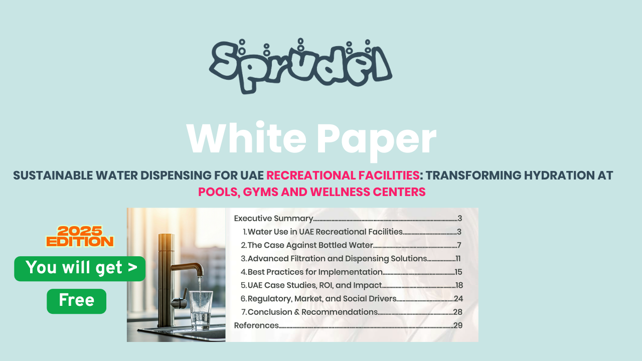 Our latest whitepaper “SUSTAINABLE WATER DISPENSING FOR UAE RECREATIONAL FACILITIES: TRANSFORMING HYDRATION AT POOLS, GYMS AND WELLNESS CENTERS” reveals the urgent need for sustainable water solutions in recreational facilities — highlighting the hidden costs, operational challenges and environmental impact of bottled water. Drawing on real UAE case studies and the latest regulatory trends, this guide explains how advanced filtration and dispensing systems like Sprudel Concept01 can enhance user experience, streamline operations, and position your venue as a leader in health, wellness and sustainability.